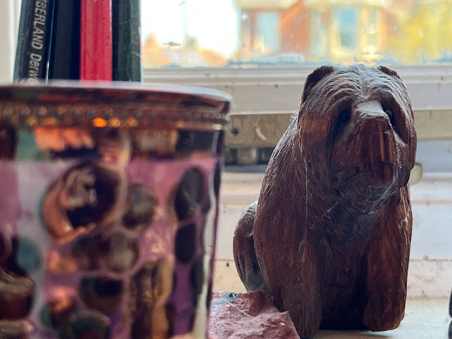 His finger prints were everywhere, from the brief case handle to the little wooden bear on the shelf, saved from his own childhood, to his engraving tools to the lilac line that shows what he did that morning, before he went to his last lunch.