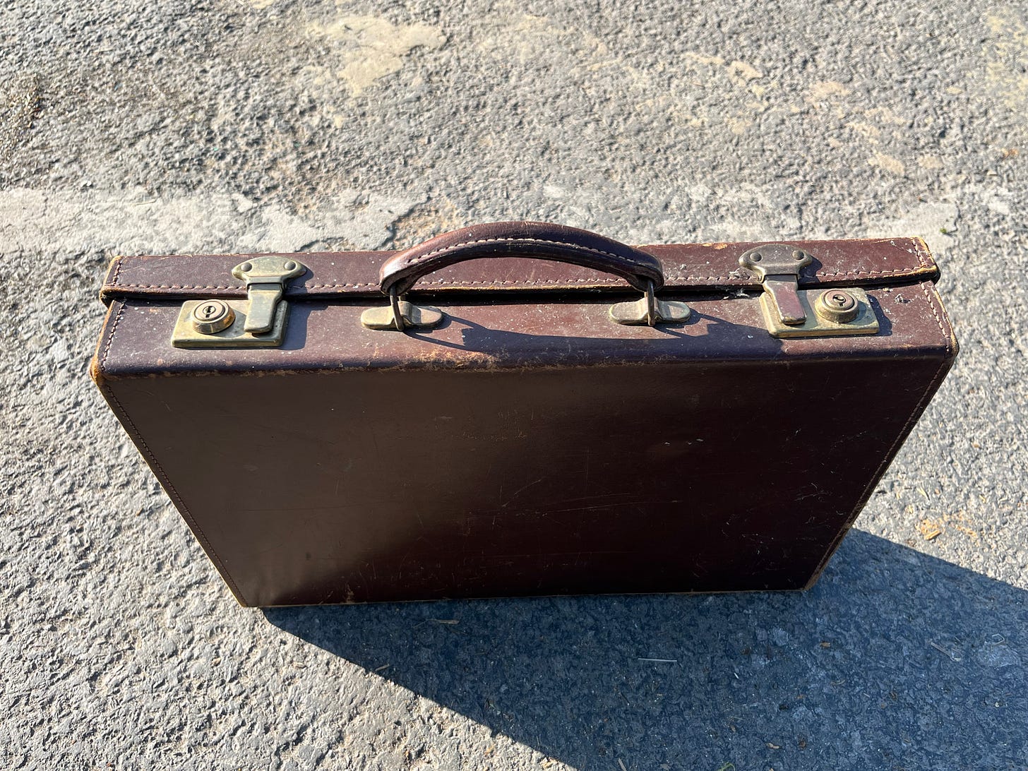 I took a deep breath. His old brown leather brief case rested against the plan chest, in which he used to carry slides and lecture notes to Marlborough College, where he taught Art. As a child, sometimes I would go with him, walking down the hill holding his hand, skipping alongside his purposeful strides.
