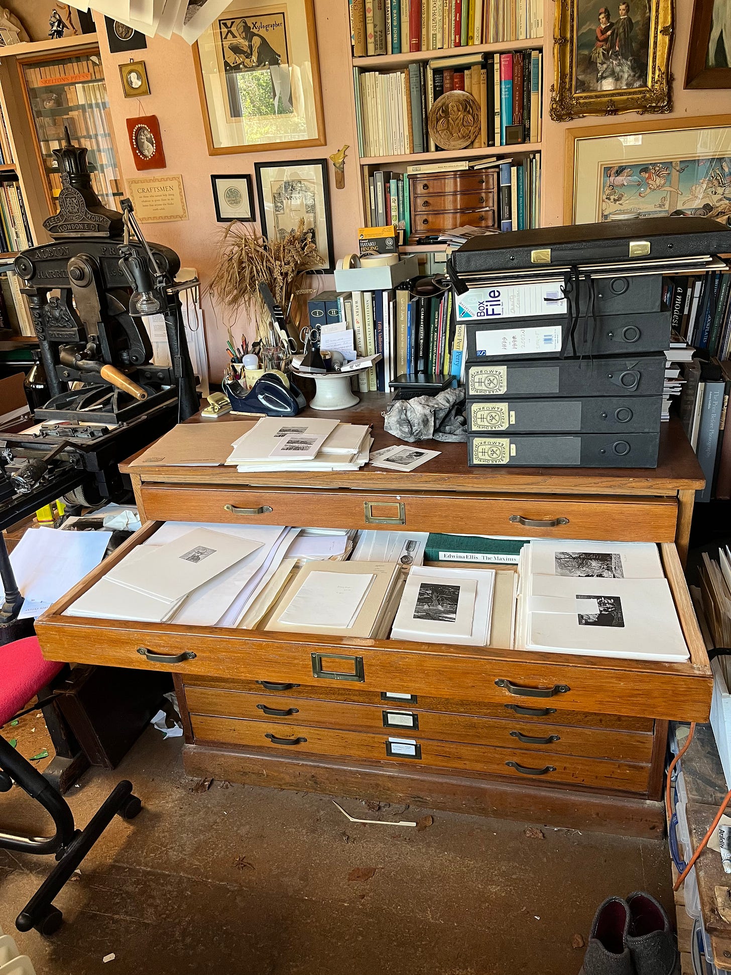 Nancy and I spent hours together there in April. Piles of prints and books sat on the work surfaces with archive boxes on the floor, labelled in black marker pen as we worked quietly. She sorted through papers and prints, identifying what was what, on a drawing board Simon had laid on the old Hopkinson & Cope press while I worked from one side of the studio to the other, looking in every drawer and folder, flicking through notebooks, so we knew where everything was. It was like putting a glass up to the wall of the past, listening as for a heart beat. The hardest part was not knowing where in time he would speak from.