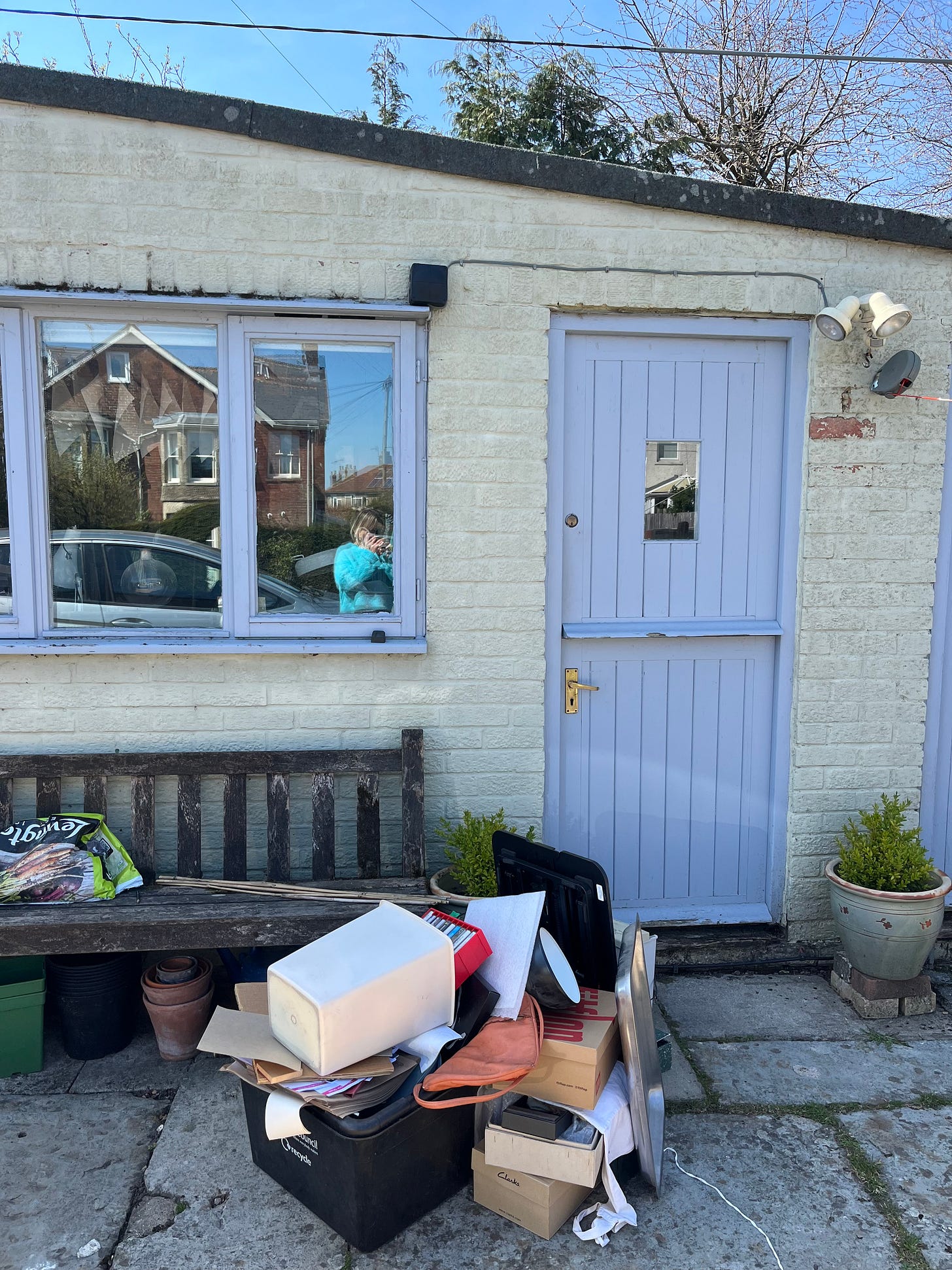 I left Baby E with Juliet and took a last car load of stuff to the recycling centre, including the brief case. The hot sun made it look like a scene from a holiday park, everyone happily getting rid of their stuff, lilic growing through the chain link fence.